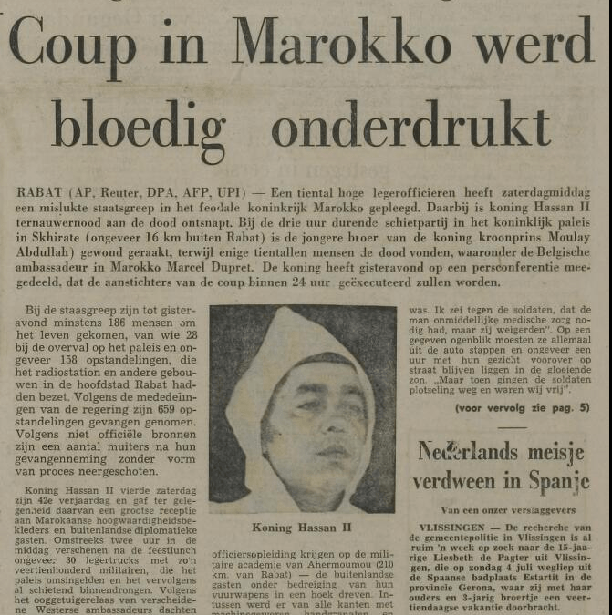 RABAT (Reuter, DPA, UPI) – Een tiental hoge legerofficieren heeft zaterdagmiddag een mislukte staatsgreep in het feodale koninkrijk Marokko gepleegd. Daarbij is koning Hassan II ternauwernood aan de dood ontsnapt. Bij de drie uur durende schietpartij in het koninklijk paleis van Skhirate (ongeveer 16 km buiten Rabat) is de jongere broer van de koning kroonprins Moulay Abdullah gewoond geraakt, terwijl tientallen mensen de dood vonden, waaronder de Belgische ambassadeur in Marokko Marcel Dupret. De koning heeft gisterenavond op een persconferentie meegedeeld, dat de aanstichters van de coup binnen 24 uur geëxecuteerd zullen worden.